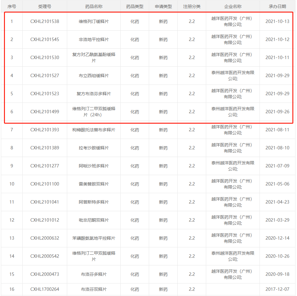 在改良型新药火热的今天,有这样一家药企,短短1个月以内,CDE承办了6款2.2类新药:维格列汀缓释片、非洛地平控释片、复方对乙酰氨基酚缓释片、布立西坦缓释片、复方布洛芬多释片、维格列汀二甲双胍缓释片(24h)。截至2021年10月13日,已经有16个2.2类新药临床申请获得CDE承办。另有多个缓控释制剂新药/仿药递交上市申请或者获得临床批件!